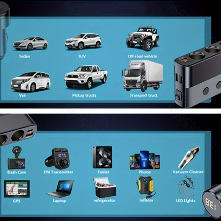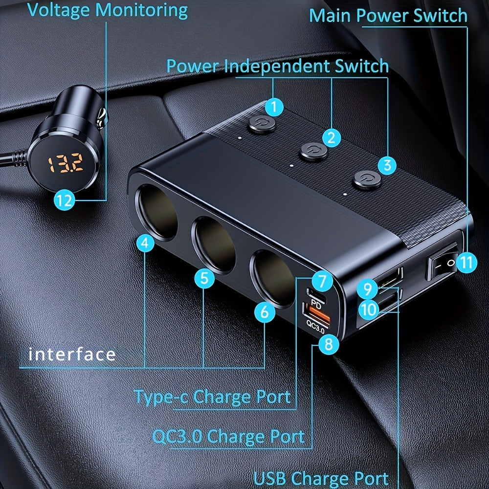 Upgrade your car charging experience with this powerful 7-in-1 car charger adapter featuring 3 cigarette lighter sockets and 4 USB ports (including Type-C and QC3.0 fast charging). Perfect for road trips, business travel, or everyday driving.
